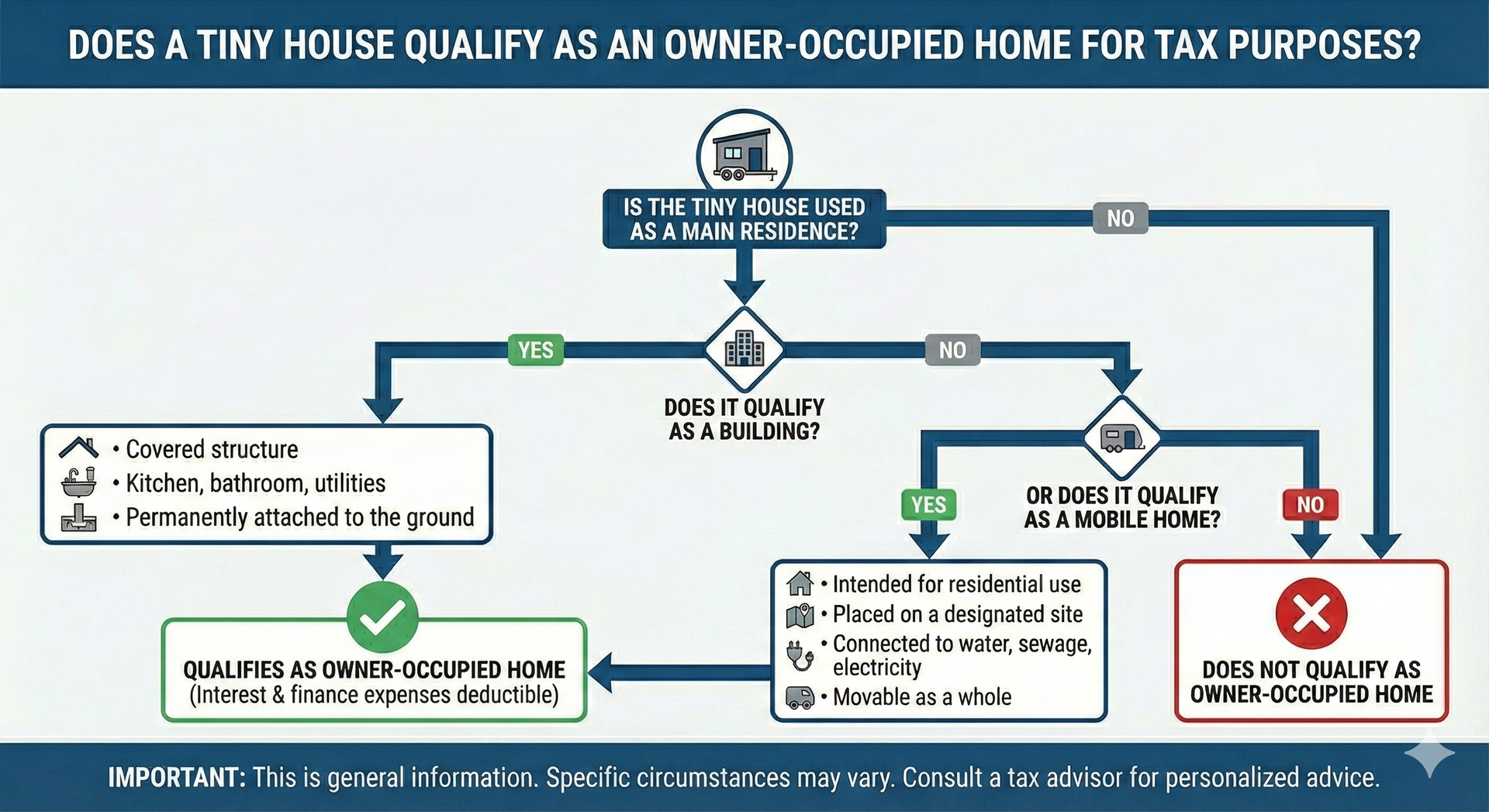 According to the Knowledge Group, a tiny house qualifies as either a building or a mobile home and therefore qualifies as an owner-occupied home for income tax purposes. As a result, mortgage interest and financing costs incurred for the acquisition of the owner-occupied home are deductible from Box 1 income.