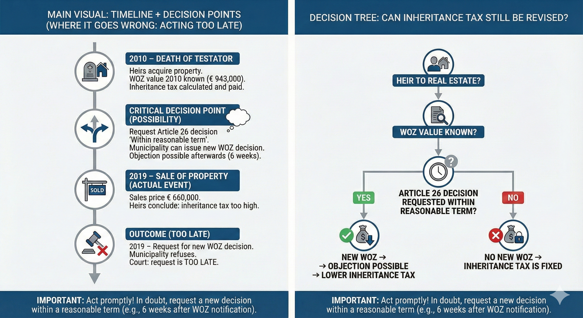 The executor contacted the Dutch Tax Authorities, who indicated that a refund of inheritance tax would only be possible if a new WOZ assessment for the 2010 tax year were issued with a lower WOZ value. The heirs would therefore have to request a so-called “Article 26 decision” from the municipality and subsequently challenge the WOZ value through an objection procedure. However, the municipality refused to issue an Article 26 decision.