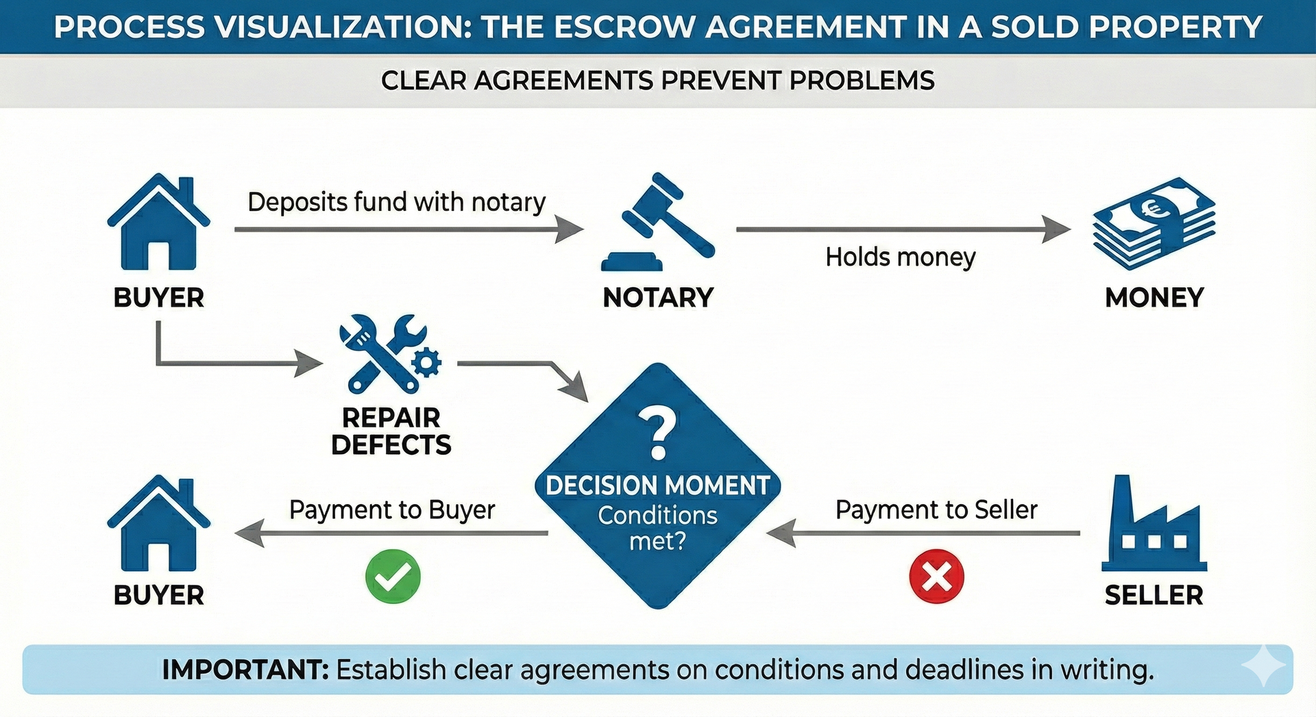 If, on the day of the notarial transfer, defects in the sold property come to light, the parties sometimes choose to place part of the purchase price in escrow with the notary. What should you pay attention to in that case?